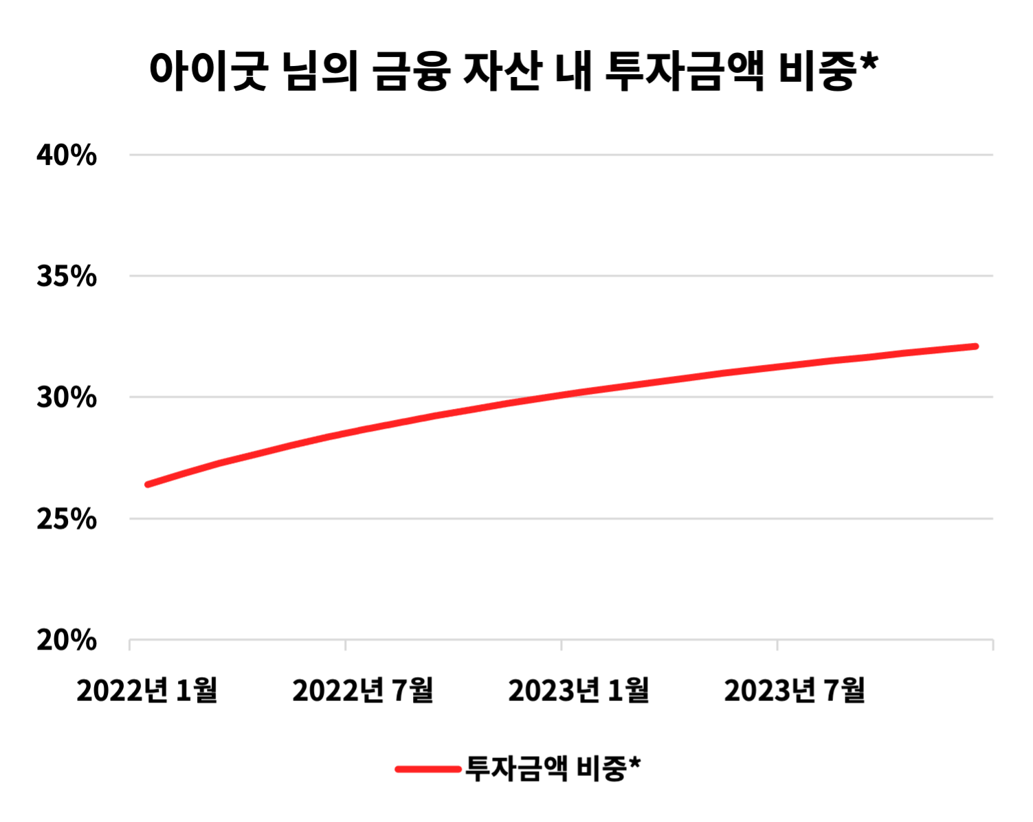 아이굿 님의 금융 자산은 결혼자금을 위한 저축이 1차 재무 목표였기 때문에 예·적금 비중(74%)이 투자 비중(26%)보다 큽니다. 작년 저축률은 56%, 올해는 40%에 이르는데요, 높은 저축률을 유지하여 자산을 형성하고 계신 아이굿 님께 박수를 보내드립니다. 주식에 집중한 투자 포트폴리오연금저축계좌는 주식형으로 가입하신 것으로 보이네요. 아이굿 님의 투자 포트폴리오는 100% 주식으로 구성돼 있는데, 국내주식뿐만 아니라 글로벌·미국·중국 펀드를 통해 해외 주식에 60% 이상 투자한다는 점에서 아주 바람직해요. 탄탄한 저축 습관! 연금은 납입 한도 채우기 Before: 매월 꾸준히 저축과 연금을 넣어왔어요. After: 이제부터 30년의 큰 그림을 그린 후 수익률과 원금을 나눠서 관리해보세요! 아이굿 님은 매월 예·적금과 연금을 꾸준히 넣어오셨고 결혼자금 마련이라는 단기 목표도 달성했습니다. 자산관리의 토대인 저축과 돈 모으기 습관이 탄탄히 자리 잡은 상태예요. 우선, 연금은 지금처럼 꾸준히 넣으면서 납입 한도를 채우는 건 권해드린다는 점을 짚고 넘어갈게요. 수익률과 원금을 나눠서 관리해보세요 이제 다음 단계로, 은퇴 시기까지의 장기 자산 증가를 그려본 후, 5년 단위로 달성 여부를 점검할 것을 추천드려요. 지금까지는 ‘저금’을 통해서 원금을 얼마나 모을 것인가에 집중했다면, 이제는 원금과 수익을 분리하여 주기적으로 성과를 점검하는 거예요. 30년 후 투자자산은?