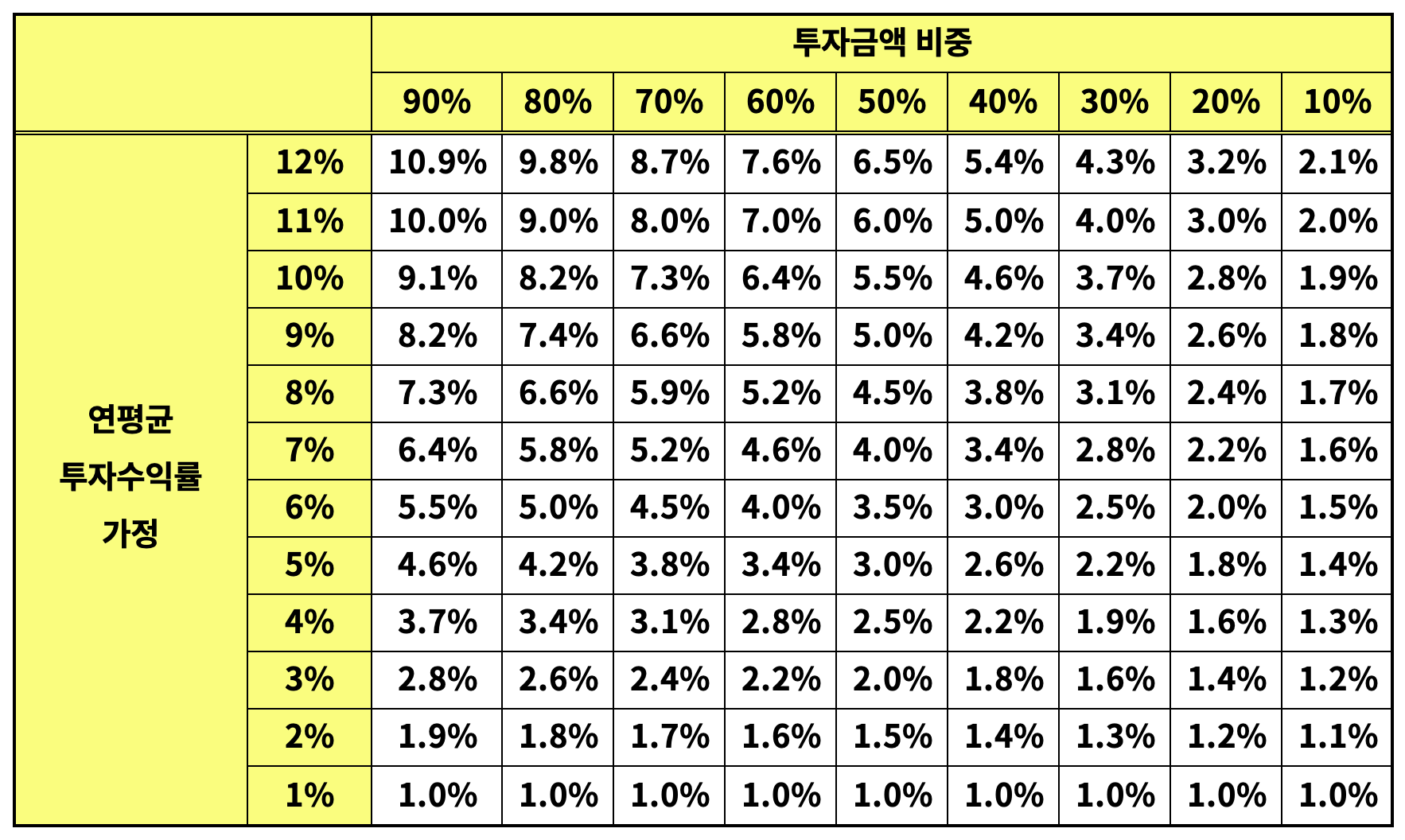 표 2. 금융 자산 내 투자금액 비중과 연평균 ‘투자수익률’ 가정에 따른 연간 목표 수익률 표 참고: 예금 금리 연 1% 가정 자료: 쿼터백