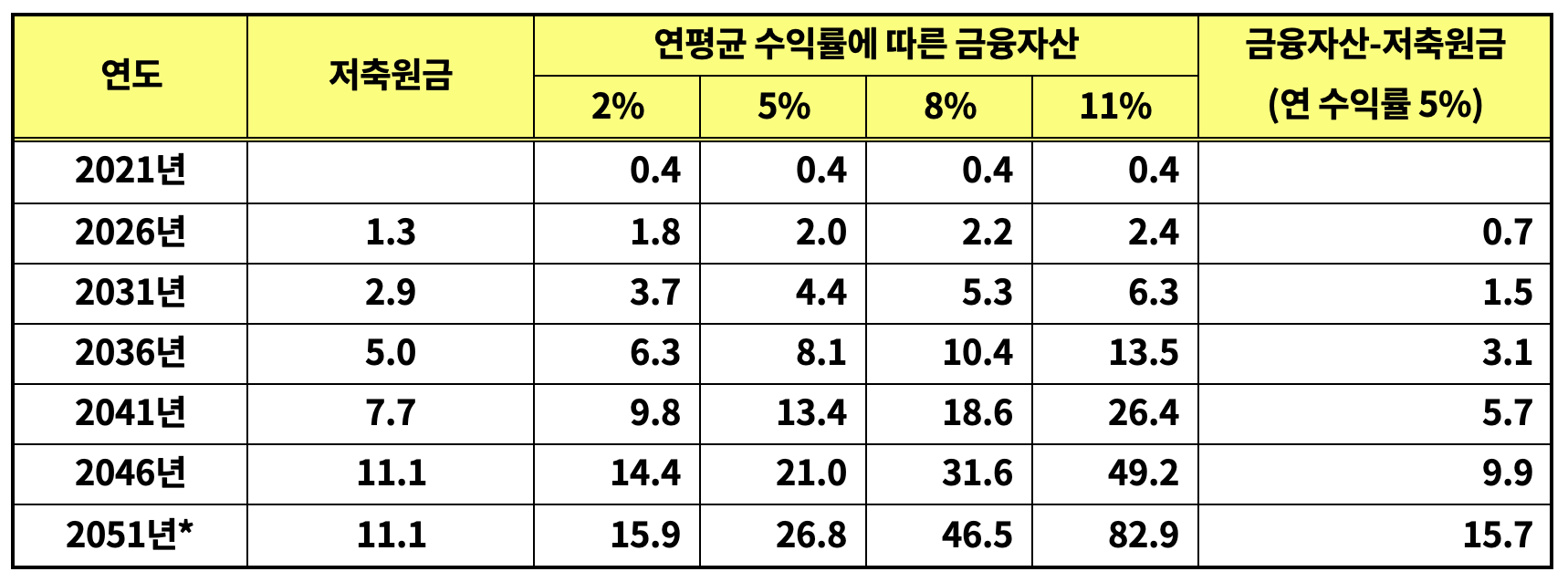 표 1. 연평균 수익률에 따른 5년 단위 금융 자산 전망(단위: 억 원) 참고: 2021년 월 저축액 193만 원과 매년 저축액 5% 증가 가정, *2046년 은퇴 및 2047년~2051년 저축 원금이 0인 것으로 가정