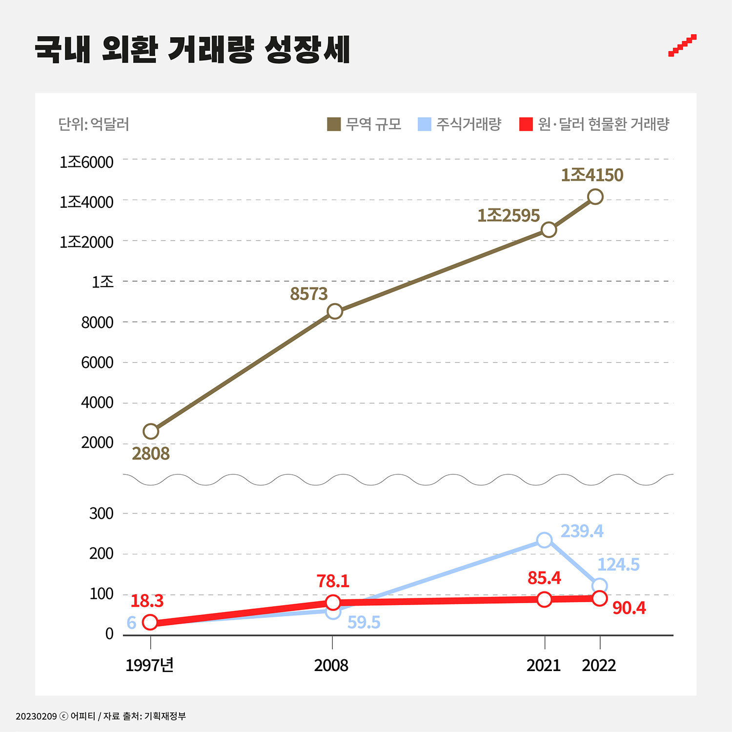 우리나라는 오랜 기간 외환시장을 폐쇄적으로 운영해왔습니다. 특히 1997년 IMF 외환위기를 겪으면서, 국내 금융시장을 안정화하는 것이 중요해져 외환시장을 개방하는 건 우선순위에서 밀려나 있었어요. IMF 이후 한국 경제는 빠르게 성장해왔지만, 외환시장에 대한 규제로 외환 거래량의 성장세는 지지부진한 편이었습니다.