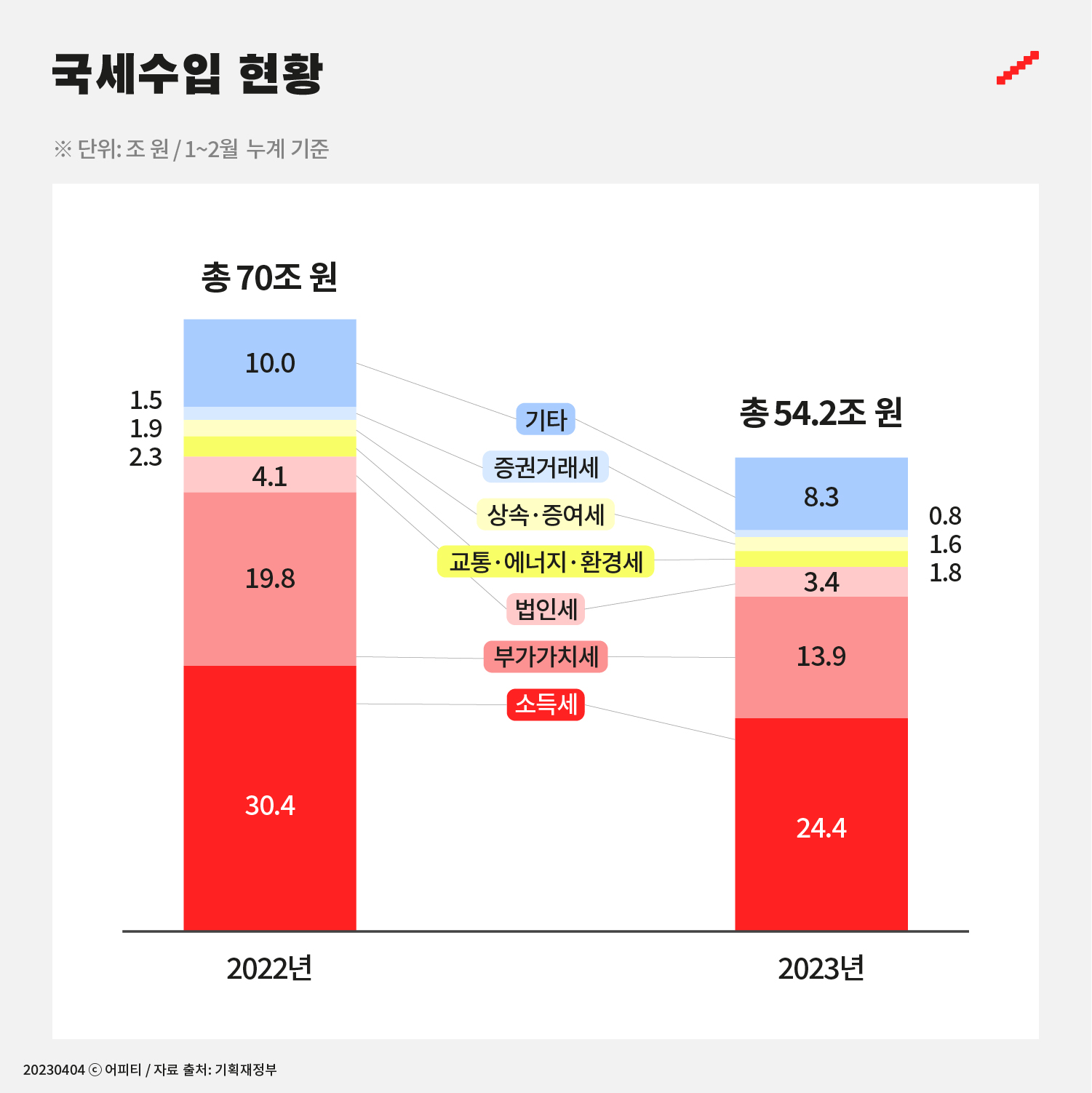 세수 결손은 정부가 거둬들인 세금보다 쓸 돈이 더 많은 상황을 가리킵니다. 우리나라가 올해 1월과 2월에 걷은 세금은 1년 전 같은 기간에 비해 총 15조 7천억 원 적어요. 3월부터 작년 3월부터 들어온 만큼 세금이 걷힌다고 해도 예산안보다 20조 원 넘게 부족한 상황이에요.